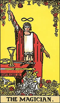 A youthful figure in the red robe of a magician stands in front of an altar. Above their head is a lemniscate and a snake wraps around their waist, resembling an ouroboros. In The Magician’s right hand is a wand raised toward heaven, while their left hand points to the earth. This pose represents the adage “As Above, So Below,” indicating that The Magician is ready to be a conduit between the spiritual and physical realms. On the table in front of The Magician are the symbols of the four Tarot suits, suggesting they have all the strengths afforded by the suits at their disposal. Beneath the altar are roses and lilies. The background of the card is bright yellow, and roses hang from vines at the top.