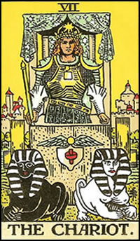 An armed figure stands in a chariot made of stone under a canopy of stars. They wear a crown adorned with an eight-pointed star, symbolic of hope and inspiration. The crescent moons on their shoulders and alchemic symbols on their tunic suggest a connection to the divine. In front of the chariot lie two sphinxes, one black and the other white. They appear to be looking in opposite directions. Rather than a set of reins, the person in the chariot holds a wand— they are moving forward through willpower alone, despite the opposing forces that lie ahead.