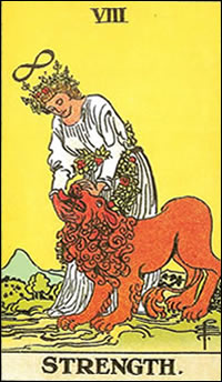 An angelic figure gently holds a lion by the mouth and chin. The person wears a laurel wreath and a lemniscate floats above their head. They wear a white gown and a wreath of roses. Rather than subduing the lion with force, the person gains the lion’s trust with calm and compassionate energy.