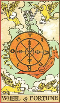 An orange wheel revolves in the heavens, inscribed with Hebrew letters that spell the unpronounceable name of God. Between the Hebrew letters are letters from the Roman alphabet which spell TORA or TAROT, depending on whether you read them counterclockwise or clockwise. The center of the wheel is inscribed with alchemical symbols. The wheel is surrounded by four winged creatures representing the elements of air, water, fire, and earth. Anubis, the Egyptian god of the dead, supports the wheel on his back while a yellow snake slithers along the wheel behind him. Atop the wheel is a sphinx with a sword, representing insight to life’s mysteries and the spiritual realm.