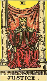 A crowned figure wears a red robe and sits between two pillars. The purple veil in the background suggests that compassion must be the underpinning in all pursuits of justice. The figure holds a sword in one hand and a balanced scale in the other. The double-edged blade of the sword is a reminder that actions have consequences, even when those actions are in the name of justice.