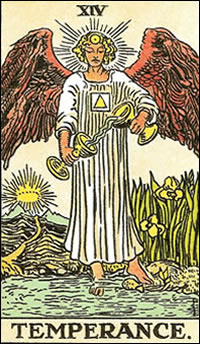 A red-winged angel, wearing the alchemical symbol for fire, pours water from one golden chalice into another. They stand with one foot in a stream of water and the other on land. In the background, a winding path makes its way toward a mountain range. The sun shines brilliantly over the mountains. Two yellow irises, a symbol of the goddess by the same name, bloom in the field of tall grass to the right of the angel. All four alchemical elements are represented in this scene.