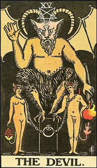 The Devil crouches on a pillar, their gray wings spread wide and their horns curved downward. An inverted pentagram sits between their horns. One hand is raised with their palm facing us, and the other hand is holding a torch pointed downward. Chained to The Devil’s pillar are The Lovers. While the two figures appear to be held captive, the chains around their necks are loose and escape would not be difficult. The figures have horns and tails, the result of being under The Devil’s influence. The figure on the right has a tail that appears to be lit aflame by The Devil’s torch, while the figure on the left has fruit growing out of their tail.