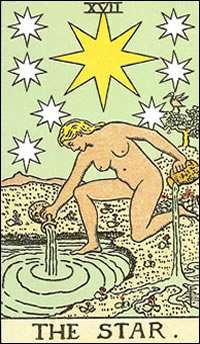 A naked, golden-haired person kneels by a pond with one foot in the water and the other on land. They pour water from two jugs: one directly into the pond and the other onto the land beside them. The water on the ground flows in several directions, with one stream leading back into the pond. The landscape is covered in grass, and in the distant background, a mountain range is just in view. Closer to the foreground is a grassy knoll topped with a tree, a bird perched on one of the branches. Even though it is nighttime, the sky is bright blue. Eight eight-pointed stars shine in the sky. Seven of those stars are white, and the one in the center is golden; itβs brighter and larger than the others.