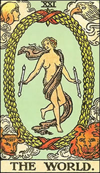 A naked figure draped in a purple cloth floats inside of a laurel wreath. They hold a wand in each hand and look back over their shoulder. A lion, eagle, bull, and angel watch over them, representing the four elements and the four suits of the tarot deck.
